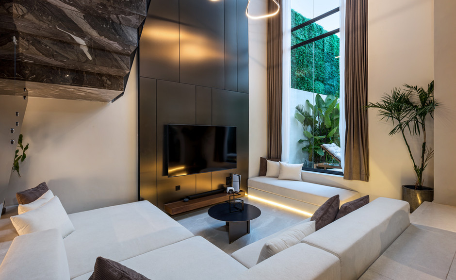This 2-bedroom villa features a monumental structure with high ceilings, panoramic floor-to-ceiling windows, and a seamless connection between indoor and outdoor spaces. The interiors are decorated with artistic sculptures, paintings, and curated installations, creating a unique atmosphere that blends luxury with creativity.